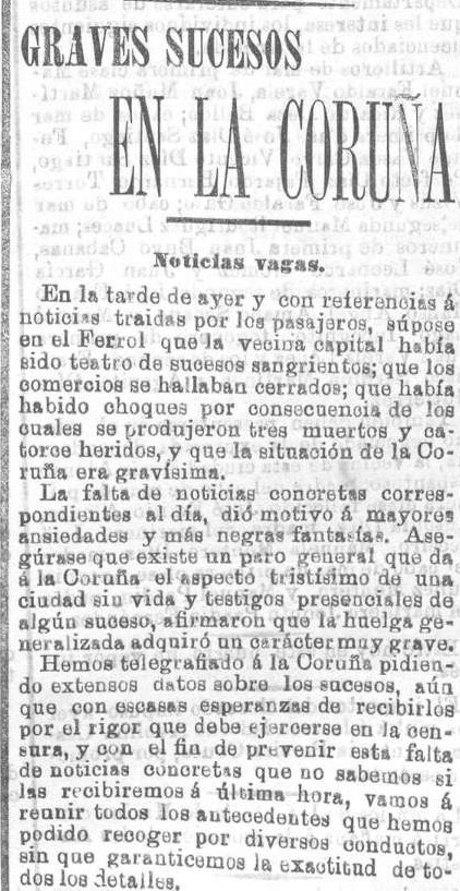 En la tarde de ayer y con referencias a noticias traídas por los pasajeros, súpose en el Ferrol que la vecina capital había sido teatro de sucesos sangrientos; que los comercios se hallaban cerrados; que había habido choques por consecuenca de los cuales se produjeron tres muertos y catorce heridos, y que la situación de la Coruña era gravísima.