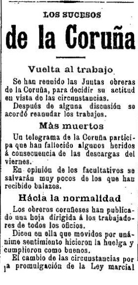 Los obreros coruñeses han publicado una hoja dirigida a los trabajadores de todos los oficios. Dicen en ella que movidos por unánime sentimiento hicieron la huelga y cumplieron como buenos. El cambio de las circunstancias por la promulgación de la Ley marcial hace indispensable que cese el derramamiento de sangre.