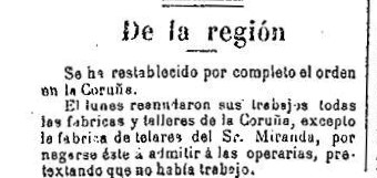 El lunes reanudaron sus trabajos todas las fábricas y talleres de la Coruña, excepto las fábricas y talleres del Sr. Miranda, por negarse éste a admitir a las operarias, pretextando que no había trabajo.