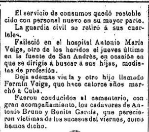 Falleció en el hospital Antonio María Veiga, otro de los heridos el jueves último en la fuente de San Andrés, en ocasión en que se dirigía a buscas a sus hijas, modistas de profesión. Deja además viuda y otro hijo, llamado Fermín Veiga, que hace catorce años marchó a Cuba.