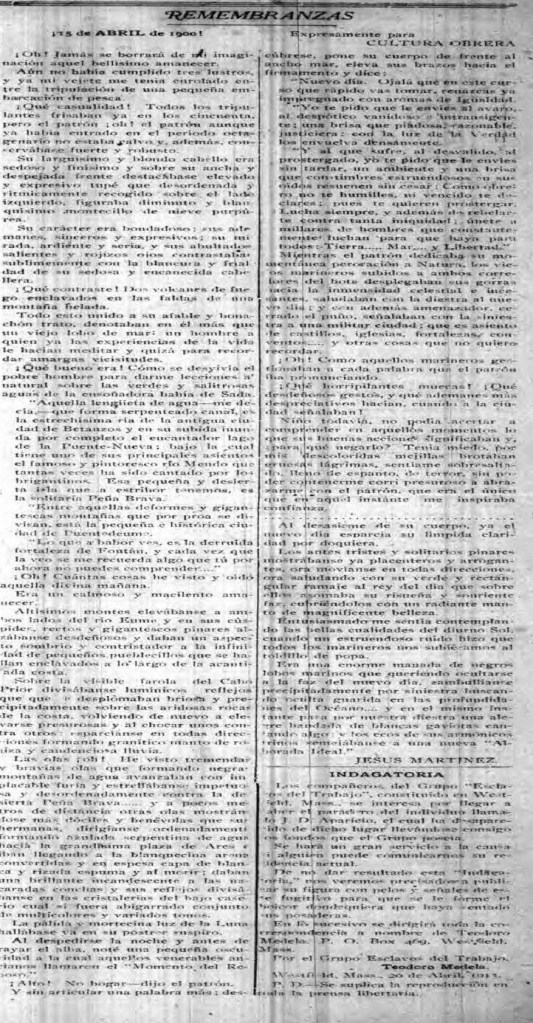 No seu número 22, do 26 de abril de 1913, aparece publicado este relato baixo o título “Remembranzas”, asinado por Jesús Martínez, no que lembra a súa primeira singladura pola ría de Ares-Betanzos-Sada, enrolado nun barco de pesca, nunha mañá de primavera de 1900, con tan só 15 anos.