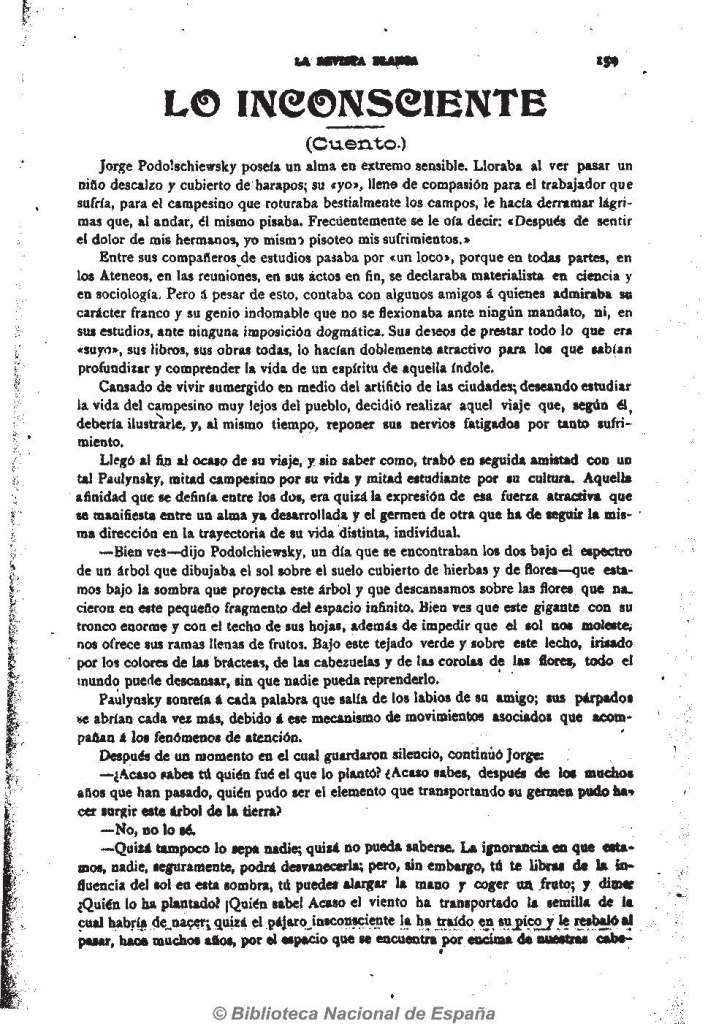 - Si el Mundo, como el árbol – dijo Podolchiewsky- fué obra de lo Inconsciente, no debes, desde luego, adorar a ningún ser impersonal, a ningún espírito: ni aún siquiera a lo inconsciente, porque lo inconsciente es necesario. Si un ser omnipotente, consciente, lo hubiera hecho, no lo haría forzosamente, y entonces era también necesario.