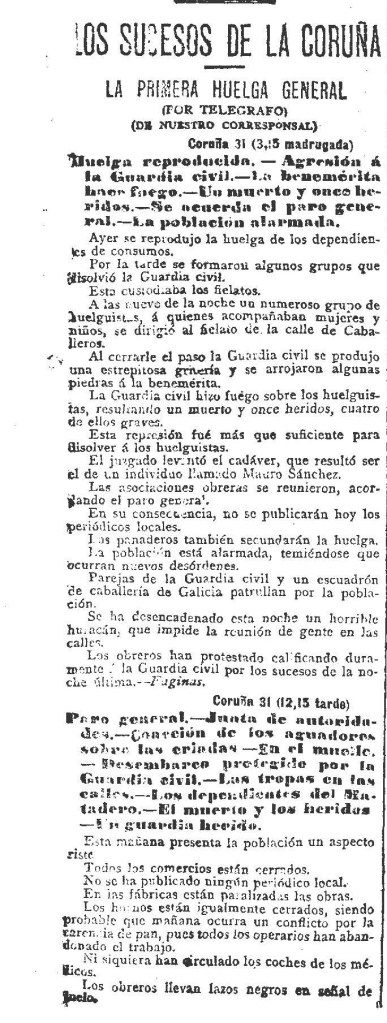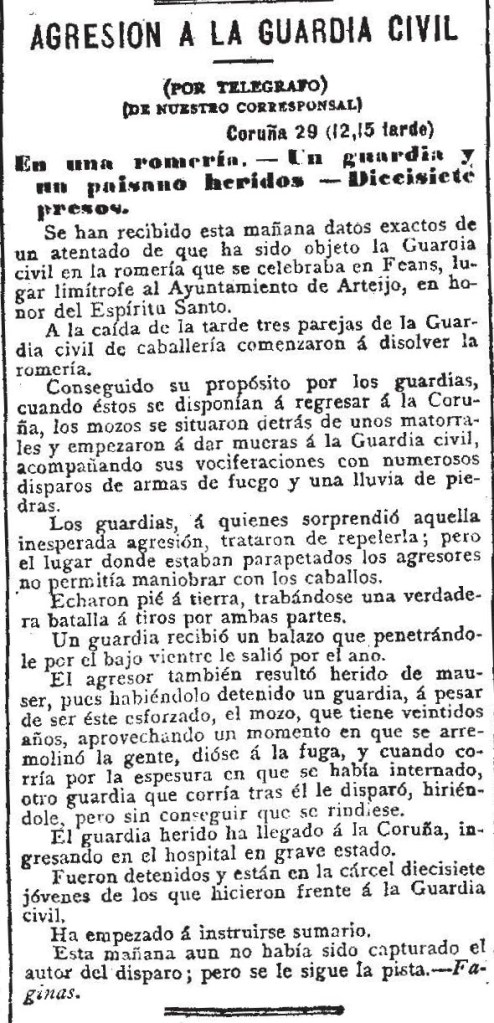 No seu exemplar do 30 de maio, na páxina 2, publican a nota enviada polo corresponsal sobre a agresión a gardas civiles que regresaban a Coruña, logo de disolver uns bailes durante unha romería en Uxes, e que semanas máis tarde sería utilizada para xustificar a brutalidade da represión contra os folguistas: