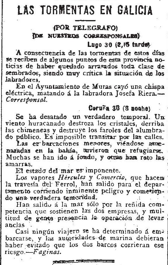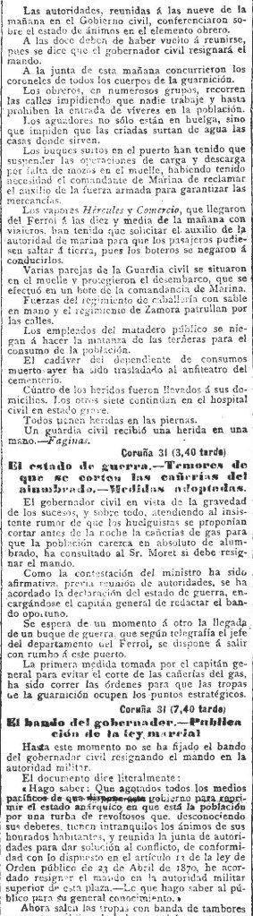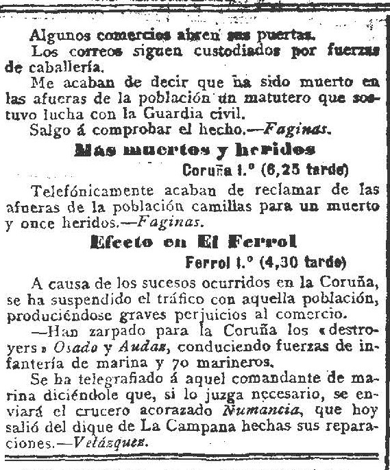 E por fin, na páxina 3, logo da sucesións de reunións gubernamentais en Madrid, aparece xa a crónica baseada nas informacións telegrafiadas polo corresponsal na cidade, Faginas, e mais unha breve nota dos efectos na veciña cidade de Ferrol: