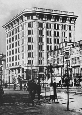 Fotografía do edificio da sede do Banco Pastor datada en 1936, atopada na web Zona Obelisco, por cortesía de El Ideal Gallego, na que aparecen tamén o Hotel Londres e mailo Café Bar Galicia.