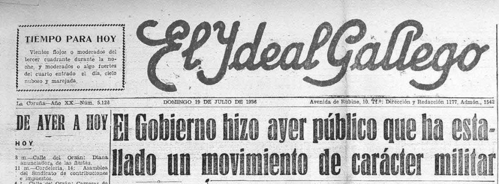 O 17 de xullo de 1936 nas colonias españolas do norte de África comezaba unha rebelión militar fascista contra o Goberno da II República. Moitas veces, asúmese que na cidade da Coruña e no resto da Galiza apenas se presentou resistencia á sublevación facciosa, pero esto non é certo e basta a lectura dun xornal tan alonxado das posicións progresistas como o xornal coruñés “El Ideal Gallego”.