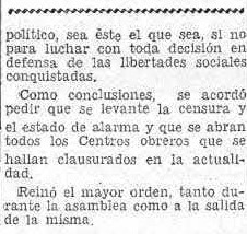 Como conclusiones, se acordó pedir que se levante la censura y el estado de alarma y que se abran todos los Centros obreros que se hallan clausurados en la actualidad.