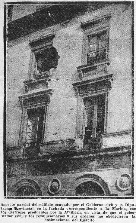 Os militares sublevados instalan unha peza de artillería no Parrote dende onde bombardean o Goberno Civil. Os gardas de asalto respostan con fogo de fusil e caen feridos varios soldados e un cabo de artillería. Os proxectiles artilleiros provocan numerosos destrozos no Goberno Civil e varios feridos e mortos. Preto dunha ducia de impactos no edificio ata que o gobernador civil rende o edificio, onde foi tomado prisioneiro xunto a Comandante da Garda de Asalto e destacados militantes obreiros e de forzas de esquerda. Foron levados presos ao Cuartel de Infantería.