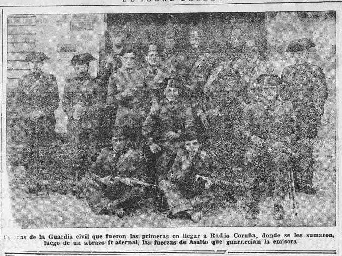 A emisora de Radio Coruña, situada na rúa de Fontán, foi entregada sen loita polos Gardas de Asalto que se pasaron aos sublevados, abrazándose aos gardas civís que ocuparon o edificio. Dende a emisora emítese o bando polo que os militares coruñeses sublevábanse contra o goberno republicano e declaraban o estado de guerra, lido por Enrique Mariñas.