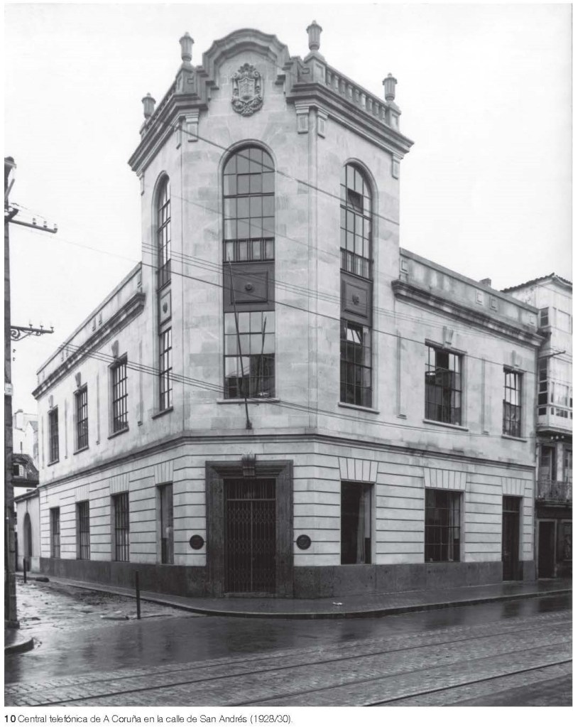 Fotografía da Central de Telefónica na rúa de San Andrés, do artigo “Las primeras centrales de Telefónica en Galicia” de Francisco Javier García Algarra, en Boletín Académico. Revista de investigación y arquitectura contemporánea da ETSA da UDC. ISSN 2173-6723 Nº2 (2012)