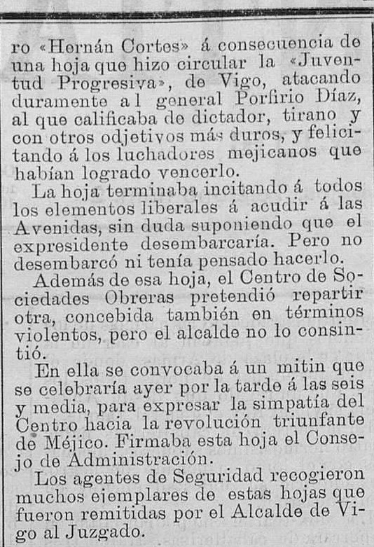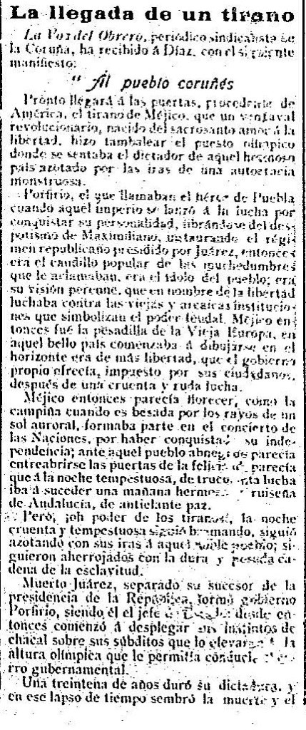 Una treintena de años duró su dictadura, y en ese lapso de tiempo sembró la muerte y el espanto por doquier, sumergió al pueblo bajo su despotismo, lanzándolo a la miseria, al caos. Méjico hoy, no es el Méjico de ayer; sus ciudadanos se encuentran sufriendo las terribles consecuencas del tirano que en breve llegará al puerto de la Coruña. Las pequeñas propiedades han sido confiscadas por Porfirio y sus secuaces, pues entre él y Ramón Corral desbalijaron al pueblo azteca, razón porque el primero posee un capital de TREINTA MILLONES DE PESOS en oro y el otro una cantidad fabulosa.