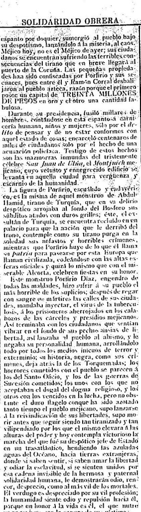 De seguido, reproduce o manifesto asinado, entre outros, polo coñecido Ricardo Flores Magón, e antes dun pormenorizado relato dos movementos revolucionarios en Méjico, recolle a resposta obreira coruñesa ao viaxe a Europa do ditador. Coñecida a viaxe do tirano e maila súa intención de establecerse en Europa, a reacción de rexeitamente da clase obreira queda reflexada nunha folla asinada polo Comité da Federación “Solidaridad Obrera de Galicia” que foi repartida entre os obreiros e obreiras, ademáis de publicada no voceiro das sociedades obreiras coruñesas “La Voz del Pueblo”, publicación de onde é recollida e publicada por “Solidaridad Obrera” no citado exemplar de 21 de xuño de 1911.