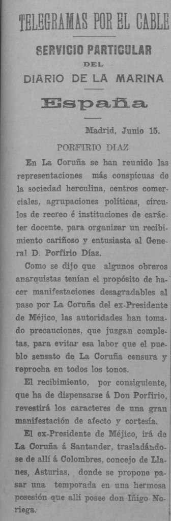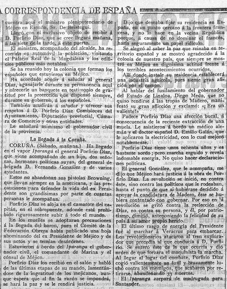 Como decíamos en nuestro último número, Porfirio Díaz ha llegado a España. Mientras unos periódicos afirman que fijará su residencia en Santander, otros asegura que irá a Suiza y más tarde se establecerá definitivamente en un pueblecito de la frontera francesa.