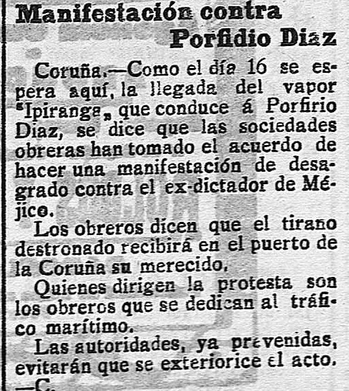 Finalmente, o día 16 de xuño de 1911 fondea o vapor que conduce ao tirano no porto da Coruña, logo de facer escala en Vigo, onde tamén houbo reaccións de protesta pola visita do ditador, como recolle o xornal compostelano “El Eco de Santiago” no seu exemplar de 17 de xuño de 1911:
