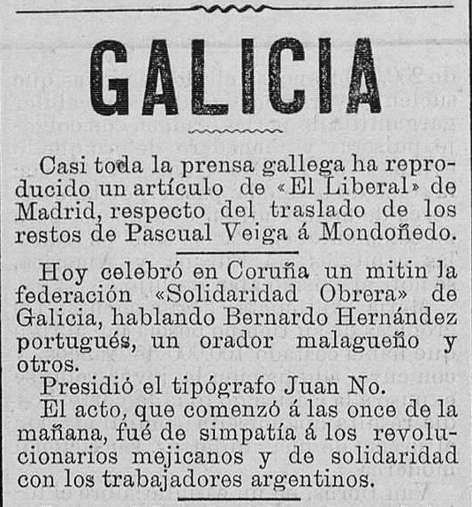 Logo da marcha do ditador en dirección a Xixón e Santander, o día 25 de xuño de 1911, ás 11 da mañá, ten lugar no Teatro-Circo un mitin organizado por Solidaridad Obrera de Galicia, en solidariedade cos traballadores de México e Arxentina, presidido polo tipógrafo coruñés Juan No, que recolle o xornal “El Noroeste” no seu exemplar do 26 de xuño de 1911:
