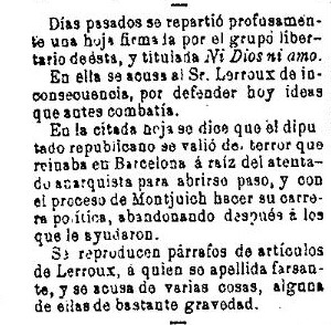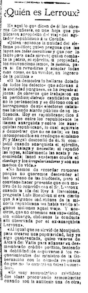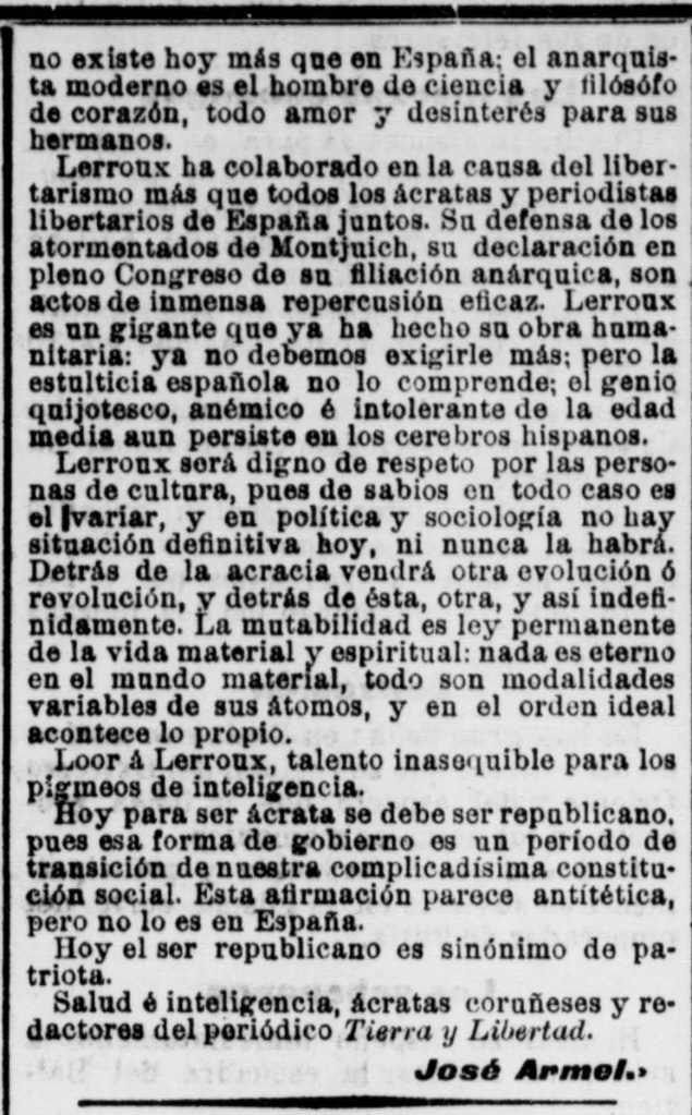 Lerroux ha colaborado en la causa del libertarismo más que todos los ácratas y periodistas libertarios de España juntos. Su defensa de los atormentados de Montjuich, su declaración en pleno Congreso de su filiación anarquica, son actos de inmensa repercusión eficaz. Lerroux es un gigante que ya ha hecho su obra humanitaria: ya no debemos exigirle más; pero la estulticia española no lo comprende; el genio quijotesco, anémico e intolerante de la edad media aún persiste en los cerebros hispanos.