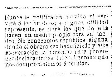 “Nunca la política ha servido ni servirá a los pueblos; si alguna utilidad representa, es para los que de ella hacen un medio propio para su medre. No conocemos república alguna donde el obrero sea beneficiado y esta aseveración la hacemos para provocar declaraciones del Sr. Lerroux que nos comprometemos a refutar”.