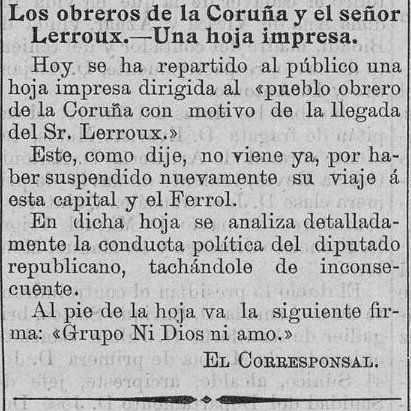 Dende o mes anterior, o grupo anarquista coruñés “Ni dios, ni amo” tiña distribuido unha folla impresa na que destapaba os intentos de manipulación dos obreiros por parte de Lerroux, como recollen varios xornais galegos da época: