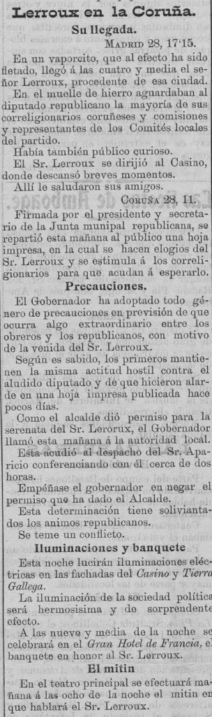 O xornal coruñés “El Noroeste” completa a información da xornada lerrouxista na cidade coa seguinte nota: