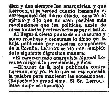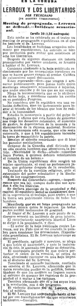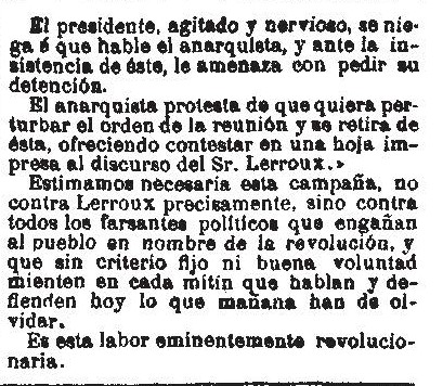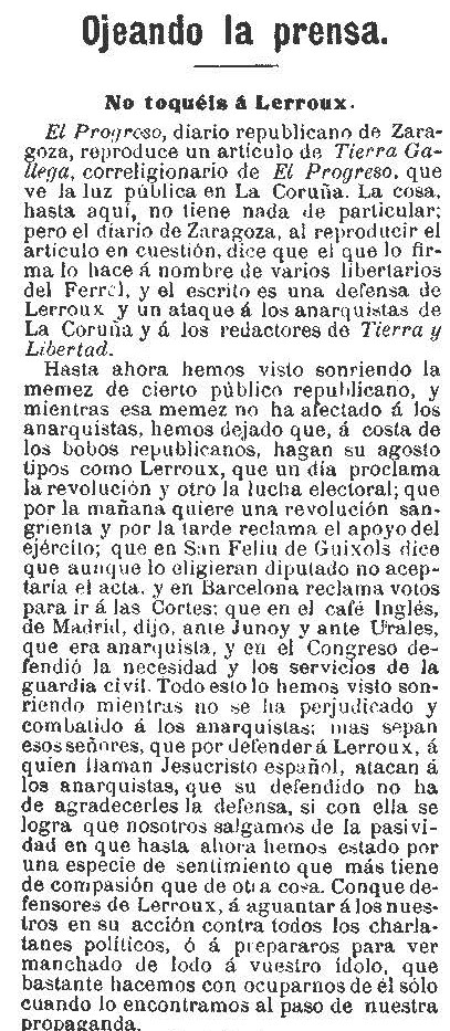 Escribimos este suelto el martes por la tarde teniendo a la vista El Imparcial, que es el único periódico de la mañana que habla del mitin republicano celebrado en la Coruña, el lunes por la noche. Por El Imparcial nos enteramos, pues, que en el local donde tenía que hablar el ex compañero Sr. Lerroux se entró por medio de invitación; que no se dió tribuna libre como pedían y dan siempre los anarquistas, y que Lerroux, si es verdad cuanto transmite el corresponsal del diario citado, ensalzó al ejército y dijo que no eran posibles más revoluciones que las políticas, amén de otras tonterías y retractaciones por el estilo.