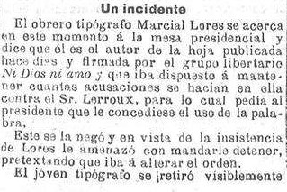 El obrero tipógrafo Marcial Lores se acerca en ese momento a la mesa presidencial y dice que él es el autor de la hoja publicada hace días y firmada por el grupo libertario “Ni Dios ni amo” y que iba dispuesto a mantener cuantas acusaciones se hacían en ella contra el Sr. Lerroux, para lo cual pedía al presidente que le concediese el uso de la palabra.