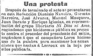Después de terminado el acto se presentaron en esta Redacción Dionisio Naveira, Germán Barreiro, José Álvarez, Manuel Mosquera, Juan dorado y Enrique Iglesias, en representación del grupo libertario “Ni Dios ni Amo”, rogándonos que hiciésemos pública su protesta contra el proceder del presidente del mitin, negándose a que el compañero Lores hiciese uso de la palabra para mantener las acusaciones que hacían a Lerroux en la hoja por ellos publicada.