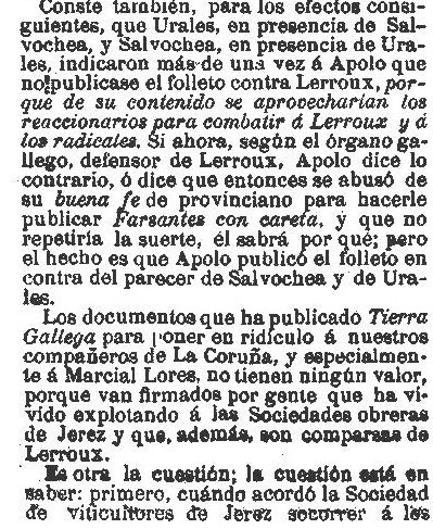 Conste también, para los efectos consiguientes, que Urales, en presencia de Salvochea, y Salvochea, en presencia de Urales, indicaron más de una vez á Apolo que no publicase el folleto contra Lerroux, permite de su contenido se aprovecharían los reaccionarios para combatir á Lerroux y á loa radicales. Si ahora, según el órgano gallego, defensor de Lerroux, Apolo dice lo contrario, ó dice que entonces se abusó de su buena fe de provinciano para hacerle publicar “Farsantes con caretas”, y que no repetiría la suerte, él sabrá por qué; pero el hecho es que Apolo publicó el folleto en contra del parecer de Salvochea y de Urales.