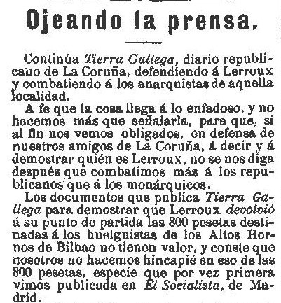 - Na referencia a “El Socialista”, podemos atopar a información no número 940, de 11 de marzo de 1904, no que se documenta a acusación a Lerroux de non enviar aos folguistas de Altos Hornos de Bilbao, encabezada por sociedades socialistas, a cantidade recaudada por pequenas aportacións de traballadores e traballadoras como apoio solidario durante a folga e que terían sido canalizadas a través do seu xornal madrileño “El Progreso”.