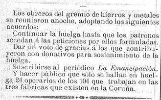 Na Coruña, os carpinteiros declaráranse en folga o 25 de maio de 1902 reclamando a xornada de 8 horas e, dende o mes de agosto de 1902, os obreiros metalúrxicos (metalistas) da Sociedad de obreros de hierros y metales, con Andrés Sánchez como secretario e Antonio Martínez como tesorero, estaban en folga reclamando a xornada de 8 horas (8 horas e media según algunhas novas) e melloras salariais.