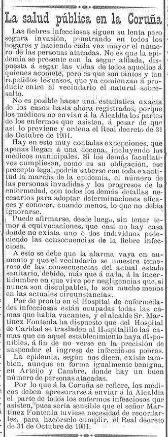 A realidade social da clase traballadora coruñesa é terrible, con alzas de prezos en produtos de primeira necesidade, problemas de acceso á vivenda, como temos visto en entradas anteriores, e con graves problemas de saúde pública: no outono de 1902, unha epidemia de febres tifoideas súmase ao habitual incremento estacional de casos de tíse (tuberculose) para cebarse coa poboación coruñesa, especialmente coas clases populares, e non sempre existe unha axeitada atención ás persoas máis necesitadas como acreditan as protestas obreiras polo abandono dos servizos benéficos municipais e contra a reposición do Dr. Muiños que fora apartado por intoxicación e desatención de doentes pobres e mala praxe, e que levaron á celebración dun mitin o 23 de novembro de 1902. Mentres, as clases acomodadas da cidade alongaban a temporada de veraneo en chalets e quintas nos concellos dos arredores, para evitar o contaxio, tal e como testemuñan novas “De Sociedad” na prensa da época.