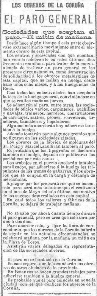 Finalmente, engadíndose tamén a solidariedade cos traballadores e traballadoras en folga en Reus, o Paro Xeral queda convocado para o día 12 de febreiro de 1903, como recolle o día anterior o xornal coruñés El Noroeste:
