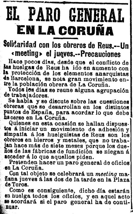 Hace pocos días, desde que el conflicto en las huelgas de Reus ha ido en aumento con la protección de los elementos anarquistas de Barcelona, se nota gran movimiento entre la población obrera de La Coruña.