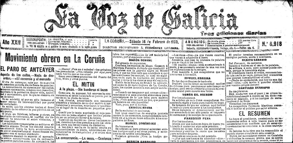 Trátase de crónicas moi extensas polo que nesta entrada recolleremos só o publicado polo xornal coruñés La Voz de Galicia o día 14 de febreiro de 1903, na súa portada e mais na páxina 2, para adicar outra entrada á cobertura da xornada de paro xeral que fixo o xornal El Noroeste: