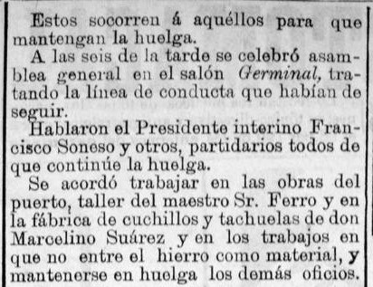 De todos os xeitos, o conflicto dos metalúrxicos aínda seguirá uns meses máis, como podemos comprobar na seguinte nota publicada no xornal compostelán El Correo de Galicia no seu exemplar do 14 de abril de 1903: