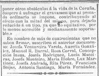 Como temos visto, en febreiro de 1903, máis de 400 mulleres asinan o escrito dirixido ao Concello contra o aforamento por peso do peixe nas básculas instaladas nos peiraos. Delas só coñecemos un feixe de nomes por non saberen ler e escribir moitas delas.