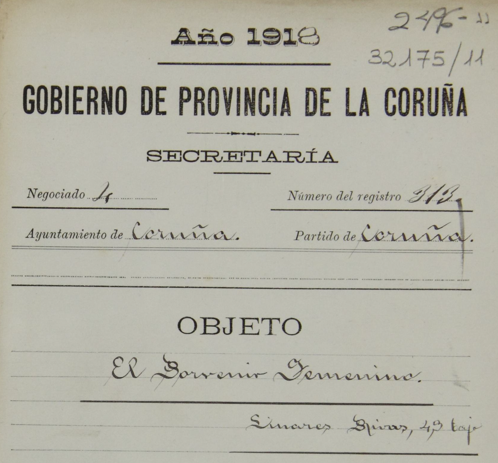 Pero hai un aspecto especialmente salientable do paro xeral de 1903: o protagonismo das mulleres na primeira liña da loita obreira. A loita das pescadeiras ou pescantinas contra o cambio do sistema de aforamento do peixe imposto pola empresa de consumo non só é a espoleta para o éxito do paro xeral do 12 de febreiro de 1903, tamén representa a incorporación das mulleres traballadoras á actividade das organizacións obreiras, nomeadamente á Federación Local Obreira da Coruña; máis aínda quedaba (cecáis, queda) moito camiño por andar. Non será ata 1918 cando atopamos a creación da Sociedade Obreira “El Provenir Femenino”, con domicilio social en Linares Rivas, 42: