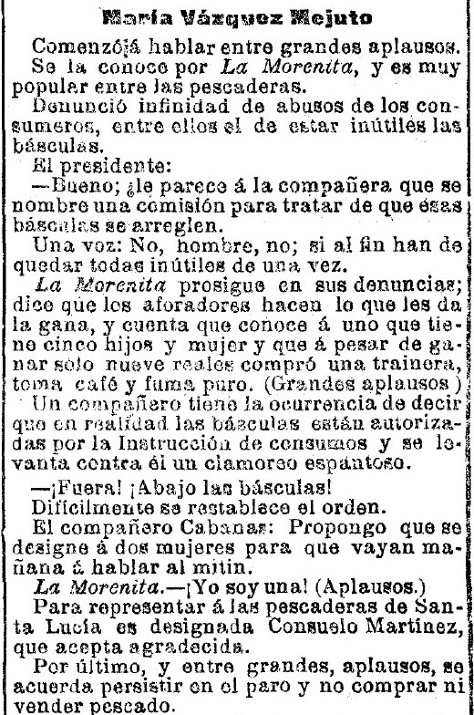 Dionisio Pereira, no artigo “As traballadoras do porto pesqueiro da Coruña: unha ollada republicana”, publicado en Nova Ardentía, Revista Galega de Cultura Marítima e Fluvial – Nº 10, en xuño de 2018, sinala a Mª Manuela Vázquez Mejuto, “La Morenita”, como a primeira muller en participar como oradora nun mitin.