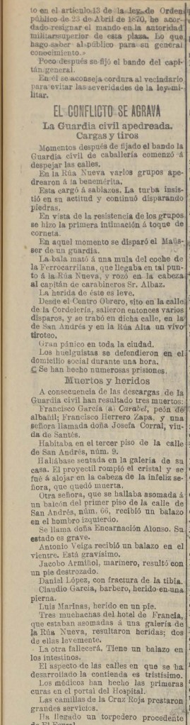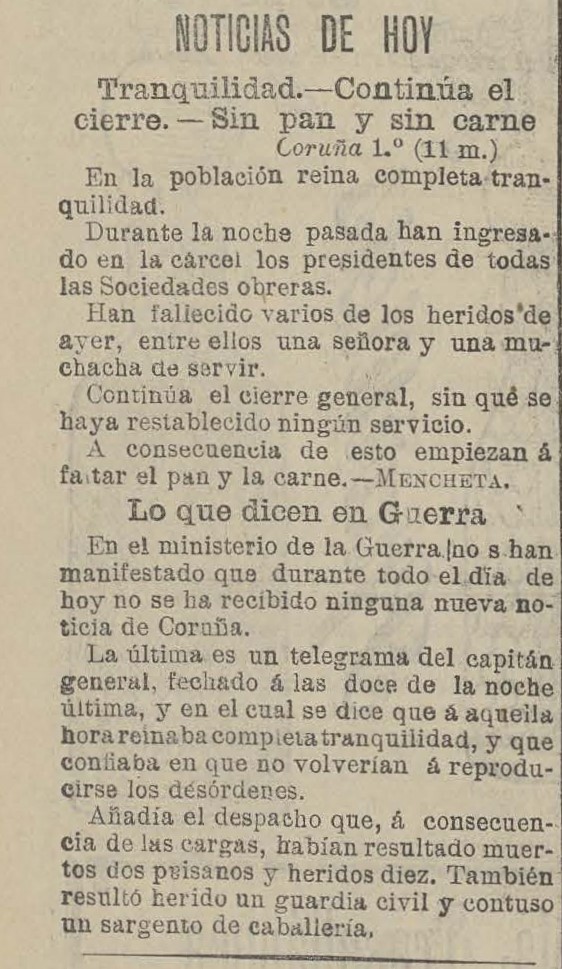Será muy difícil conocer en unos días los detalles de las tristes jornadas que han ensangrentado las calles de la Coruña, porque por la huelga no se publican allí periódicos y las autoridades militares han impedido e impedirán, mientras dure el estado excepcional, que circulen telegramas particulares.