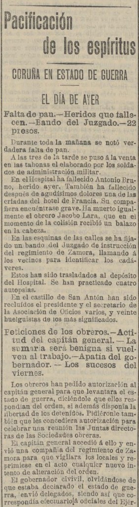 No que atinxe ás novas do que acontecía neses momentos na cidade, atopamos a seguinte crónica baixo o mesmo titular irónico “Pacificación de los espíritus”: