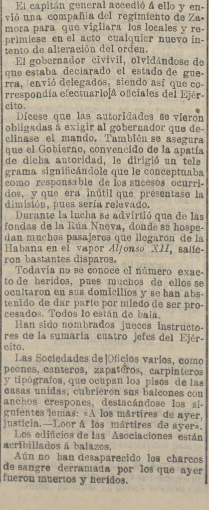 Durante la lucha se advirtió que de las fondas de la Rúa Nueva, donde se hospedan muchos pasajeros que llegaron de la Habana en el vapor Alfonso XII, salieron bastante disparos.