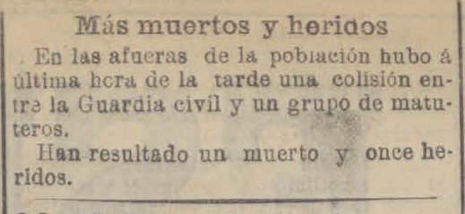 En el Hospital ha fallecido Antonio Bruno, herido ayer. También ha fallecido después de agudísimos dolores una de las criadas del Hotel de Francia. Su compañera se encuentra grave. Ha muerto igualmente el obrero Jacobo Lara, que en el momento de la colisión recibió un balazo en la cabeza.