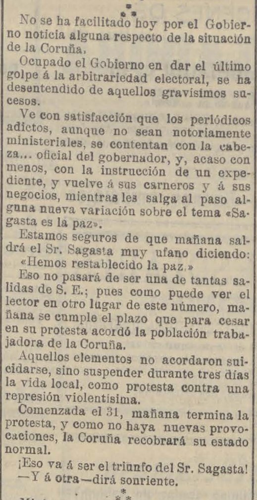 Eso no pasará de ser una de tantas salidas de S.E.; pues como puede ver el lector en otro lugar de este número, mañana se cumple el plazo que para cesar en su protesta acordó la población trabajadora de la Coruña.