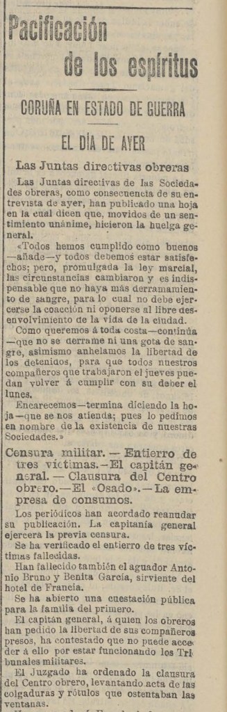 Censura militar.- Entierro de tres víctimas.- El capitán general.- Clausurado el Centro obrero.- El “Osado”.- La empresa de consumos.