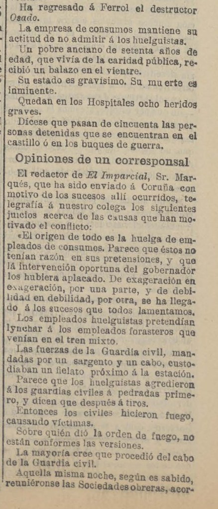 El redactor de El Imparcial, Sr. Marqués, que ha sido enviado a Coruña con motivo de los sucesos allí ocurridos, telegrafía a nuestro colega los siguientes juicios acerca de las causas que han motivado el conflicto.