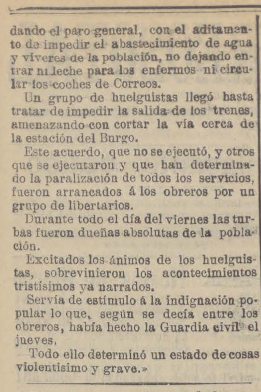 “El origen de todo es la huelga de empleados de consumos. Parece que éstos no tenían razón en sus pretenciones, y que la intervención oportuna del gobernador lo hubiera aplacado. De exageración en exageración, por una parte, y de debilidad en debilidad, por otra, se ha llegado a los sucesos que todos lamentamos.