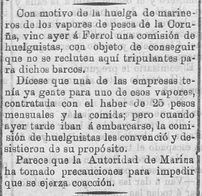 O día 27, unha comisión de 10 traballadores, non 15 como se dixera inicialmente, fora a Ferrol a evitar a contratación de crebafolgas e a descarga de peixe dos vapores que sairan do porto coruñés. Cando chegan ao porto ferrolán, atopan que xa os armadores tiñan crebafolgas dispostos a se enrolar “por 25 duros mensuales y la comida” mais conseguiron convencelos e decidiron non embarcar. Tamén lograron que a tripulación doutro dos vapores, o Primero do armador Molina, que estaba a ser reparado en Ferrol, decidira unirse á folga e desembarcase.