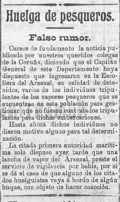 Sen embargo, dous días máis tarde, El Correo Gallego, no seu exemplar de 30 de xullo de 1906, desminte a información dos xornais coruñeses acerca da detención dos traballadores de pesca coruñeses na Escollera do Arsenal.
