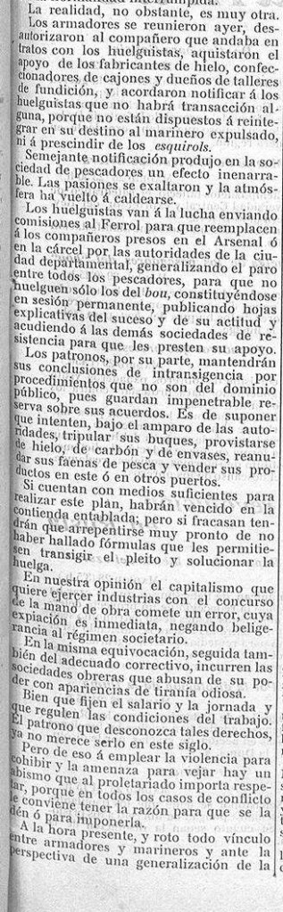 Se no seu exemplar anterior o xornal El Noroeste publicaba a súa columna de opinión sobre este tema có titulo “Conflicto Conjurado“, a columna do día seguinte, 29 de xullo de 1906, levaba por título “Obreros y patronos, guerra declarada”.