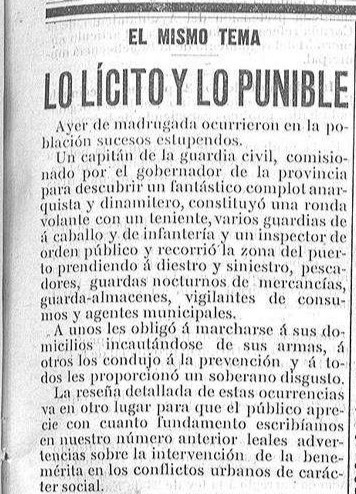 Un capitán de la guardia civil, comisionado por el gobernador de la provincia para descubrir un fantástico complot anarquista y dinamitero, constituyó una ronda volante con un teniente, varios guardias de a caballo y de infantería y un inspector de orden público y recorrió la zona del puerto prendiendo a diestro y siniestro, pescadores, guardas nocturnos de mercancías, guarda-almacenes, vigilantes de consumos y agentes municipales.