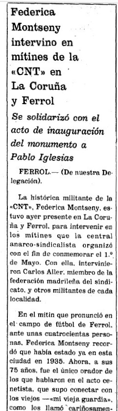 La histórica militante de la “CNT”, Federica Montseny, estuvo ayer presente en La Coruña y Ferrol, para intervenir en los mítines que la centra anarco-sindicalista organizó con el fin de conmemorar el 1º de Mayo. Con ella, intervinieron Carlos Aller, miembro de la federación madrileña del sindicato, y otros militantes de cada localidad.